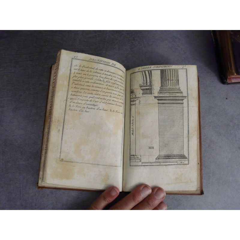 Sans date XVIIIe siècle. plein veau brun de l'époque. 1 volume in 8 de 18 x 11,5 cm 50 feuillets pagination de 1 a 88 avec des feuillets hors pagination. 2 frontispice gravés & avec vignole royales, l'autre avec traité des cinq ordres... L'ouvrage contient 58 planches gravées dont 4 dépliantes. Etat moyen, livre manipulé avec des salissures surtout sur les 4 dernières planches dépliantes.Reliure frottée et usagées.