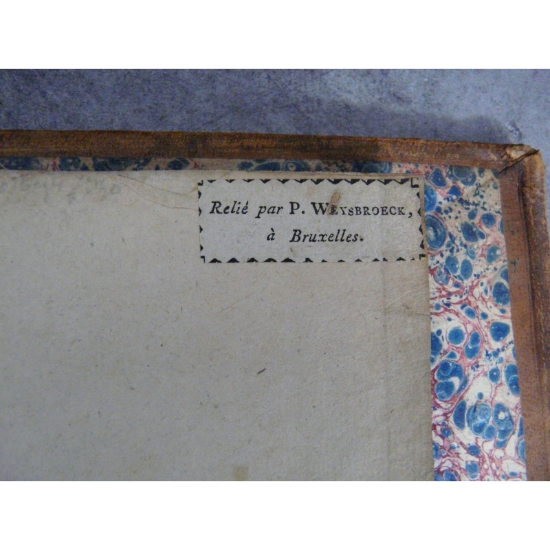 Un volume in quarto 26,5 x 21 cm reliure en veau marbré de l'époque,reliure de Weysbroeck à Bruxelles page de titre rafraichie à 1817 mais tous les cuivres sont du XVIIIe siècle et en bon tirage.