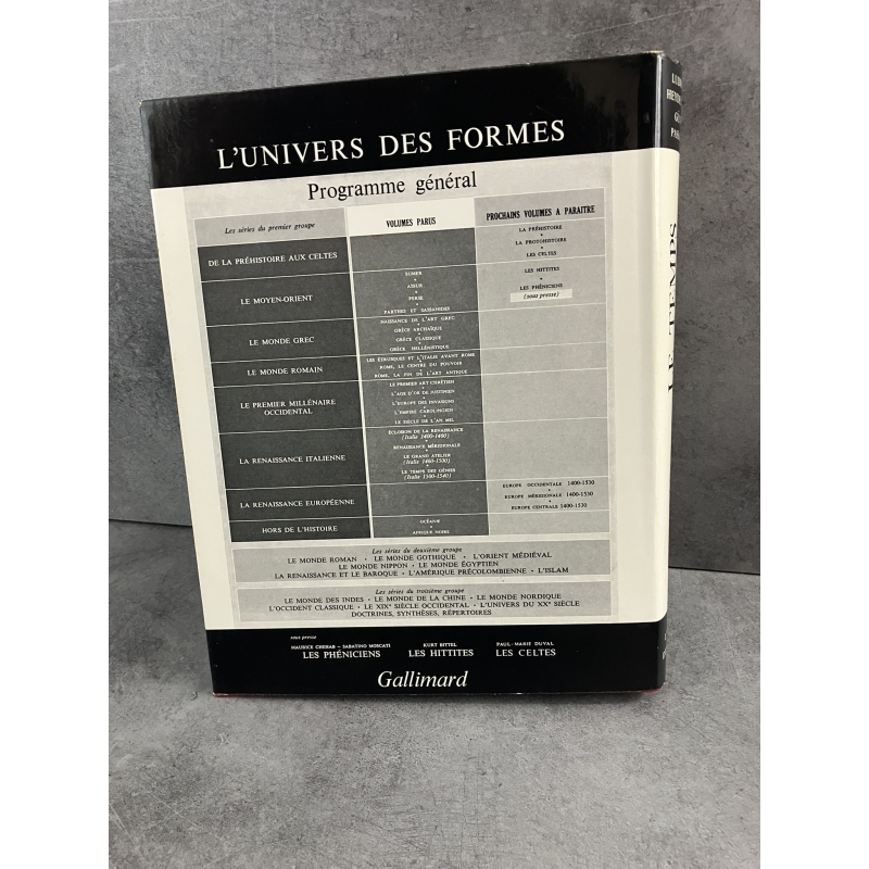 Nrf Gallimard L'univers des formes Un grand et fort volume 28 x 20 cm reliure rigide toile rouge de l'éditeur plus jaquette. 461 pages richement illustré. Livre et jaquette en très bon état, proche du neuf infimes frottements en bord de jaquette. Edition du 15 janvier 1974