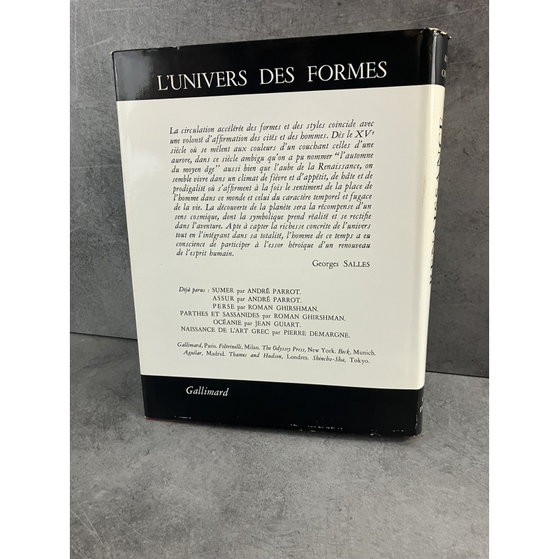 Nrf Gallimard L'univers des formes Un grand et fort volume 28 x 20 cm reliure rigide toile rouge de l'éditeur plus jaquette. 387 pages richement illustré. Livre et jaquette en très bon état, proche du neuf infimes frottements en bord de jaquette. Edition du 1er juillet 1965