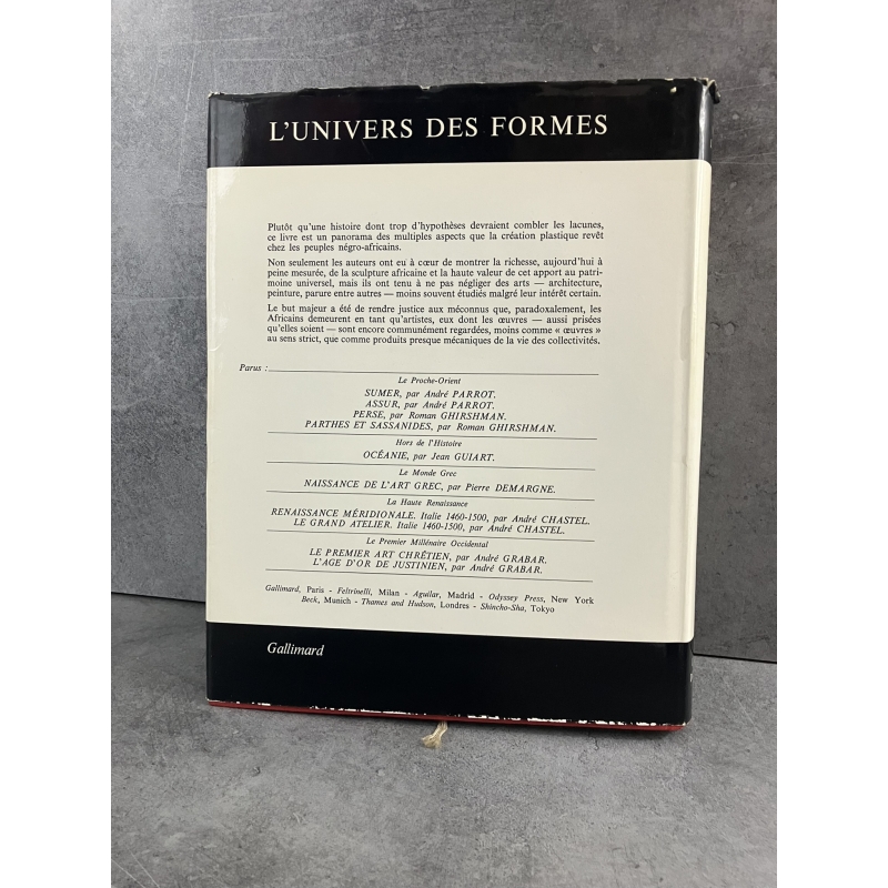 Nrf Gallimard L'univers des formes Un grand et fort volume 28 x 20 cm reliure rigide toile rouge de l'éditeur plus jaquette. 453 pages richement illustré. Livre et jaquette en très bon état, frottements en bord de jaquette vers la coiffe et petite fissure d'1 cm en pied de jaquette Livre en parfait état Edition du 28 fevrier 1967