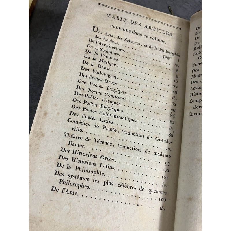 Dans ces volumes sont traités tous les sujets que devaient connaitre une personne bien éduquée, le tome 1 est consacré plus à l'histoire ancienne, le Tome 2 des sciences et de la philosophies des anciens , architecture scupture peinture musique danse poésie, Tome 3 histoire romaine Tome 4 géographie de l'amérique et histoire du portugal, T5 Lois moeurs usages littérature Art et sciences chirurgie botanique peinture de la musique de l'opéra ....Edition en partie originale augmentée de plus de 700 pages.