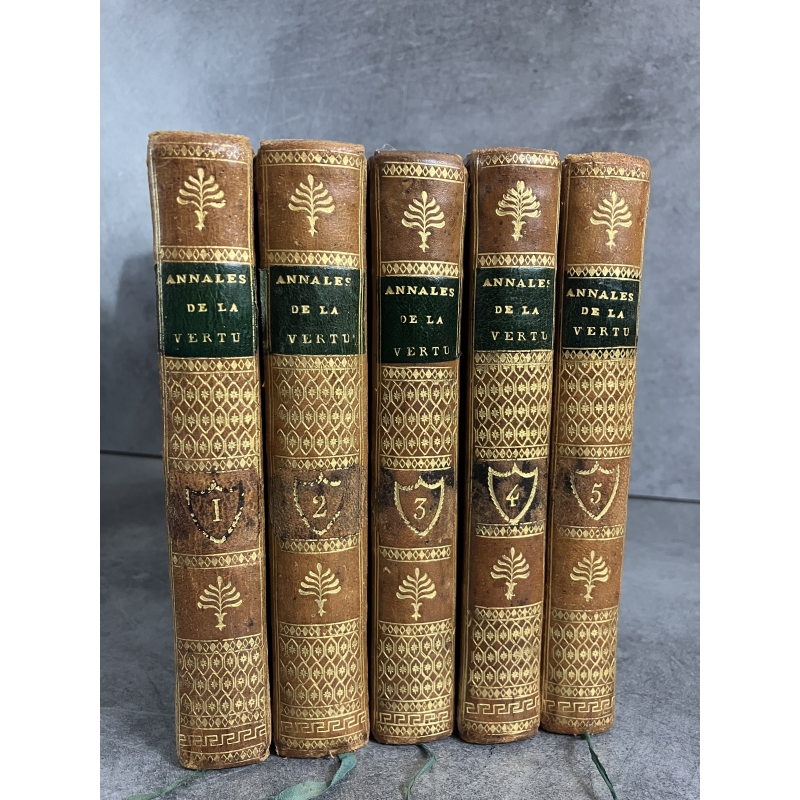 Paris Maradan 1808 5 volumes in 12 de XVIII, 430, 503, 464, 444, 459 pages plein veau moucheté, dos lisse orné d'un décor doré strictement de l'époque, alternant palmette, semi, grec, etc. Piece de titre en maroquin marine, et tomaison à même les dos . Papier de garde à la cuve. tranches jaunes.