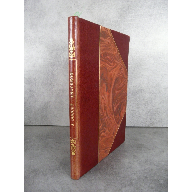 DOUCET (Jérôme). Anacréon (Introduction et Pièces choisies). Illustré de huit compositions de Louis-Edouard Fournier, eaux-fortes de Pennequin. Paris, Librairie des amateurs, A. Ferroud, 1903. Reliure demi maroquin à coins rouge brique, plats avec délimitation par filet doré en marge du papier coloré, dos lisse orné de motifs et d'un titre dans la longueur encadré d'un filet doré, page de garde en papier coloré, tranche supérieure dorée. Format grand in-8. feuillets liminaires, VII - 28pp, . Tirage total à 225 exemplaires numérotés, celui-ci 169 des 150 sur vélin du Marais. Huit vignettes en en-tête de Louis-Edouard Fournier gravées à l'eau-forte par Pennequin. Très belle reliure signée Flammarion. Rousseurs dans le texte. Ex-libris.