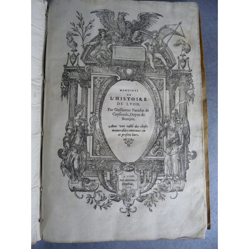 Paradin Guillaume Mémoire de l'Histoire de Lyon par Guillauùme Paradin de Cuyseaulx, doyen de beaujeu avec une table mémorable es choses contenues en ce présent livre Antoine Gryphe Lyon 1573 1 volume in folio 8 feuillets, 444 pages, 8 feuillets Plein velin du temps , traces de lacets .