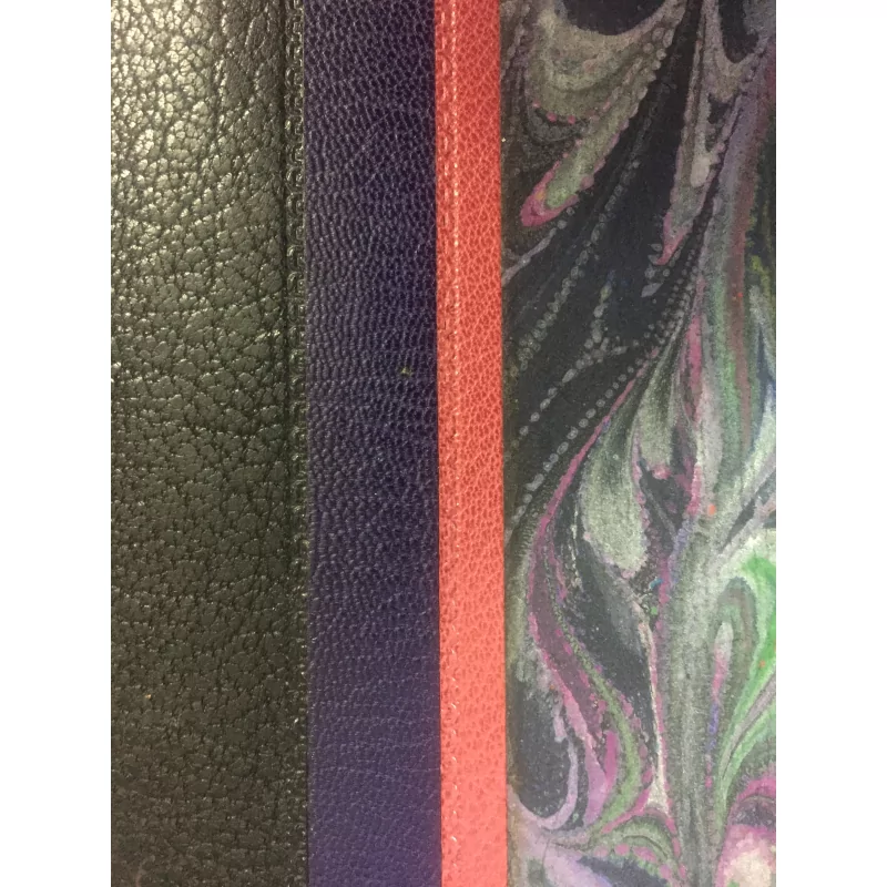 Reliure demi maroquin noir à bandes, une bande de maroquin bleu et une bande de maroquin rouge incrustées et sertiessà froid d'une fine roulette. Plats papier main et gardes papier main, mors interne de maroquin noir. Coiuvertures et dos conservés. titre et auteur dorés en long. Reliure signée G.Pillard