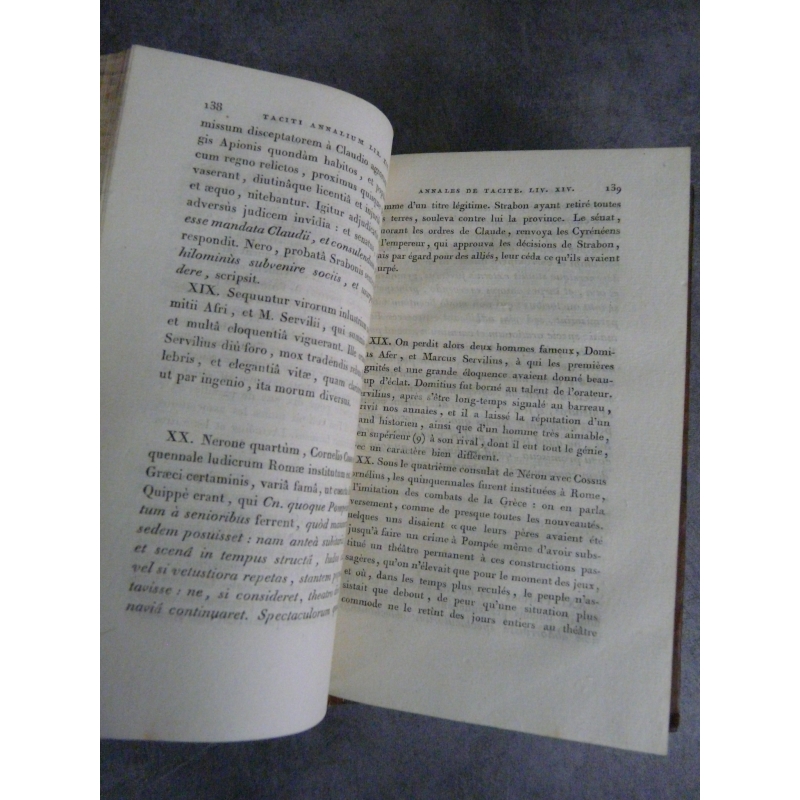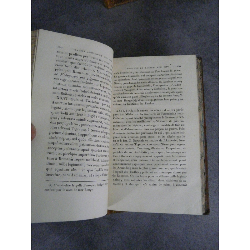TACITE (DUREAU DE LAMALLE trad.) Tacite. Nouvelle traduction. Deuxième édition revue et corrigée. Paris, chez Giguet et Michaud, chez Nicolle, de l'imprimerie Mame, 1808. Les Annalles 3 volumes in-8 (20 x 13 cm). Reliure plein veau marbré, encadrement des plats par une élégante roulette, dos lisses à caissons dorés et pièces de titres maroquinées, gardes colorées, roulette sur les coupes, tranches jaspées. Vol. 1 : vij, lxiv, xx, une carte rempliée, 415 pages - vol. 2 : 2 feuillets, 417 pages - vol. 3 : 2 feuillets., 405 pp. Bel exemplaire très frais. Ancienne et charmante étiquette de libraire. Cette tête de collection comprend Les annalles complets. L'édition totale des oeuvres se fit en 5 volumes.