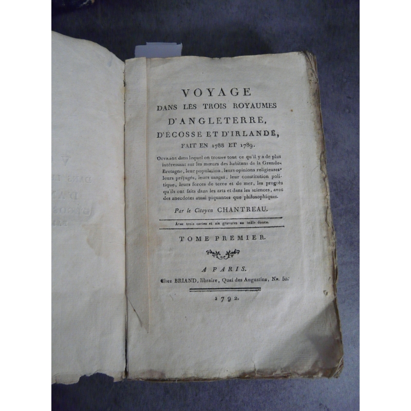 Unique édition de ce récit de voyage que Pierre-Nicolas Chantreau (1741-1808) fit paraître au début de la Révolution, les déclamations contre la "superstition" et "l'ignorance", la louange des vertus "philosophiques" et des "établissements de bienfaisance" des peuples britanniques, nous rappelle l'époque troublée de la parution.