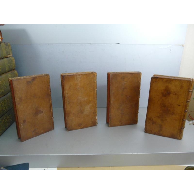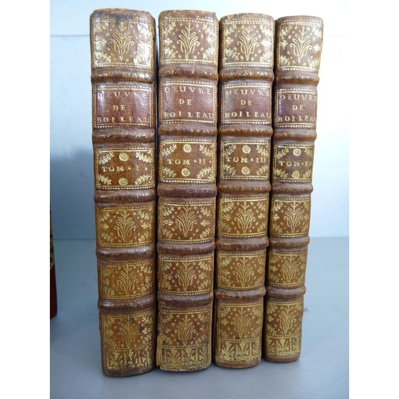 Oeuvres de Nicolas Boileau Despréaux avec des eclaircissemnts historiques donnez par lui même. Nouvelle édition revue corrigée et augmentée enrichie de figures gravées par Bernard Picart dit le romain. A la Haye Vaillant Gosse Hondt 1722 4 volume in 12 (feuillets de 165 x 95 mm) de T1 : Frontispice, 2 feuillets, XLVI pages , 1 feuillet de table, 436 pages T2 VIII, 407 pages 6 gravure hors texte ppour le lutrin. T3 2 feuillets , 407 pages, T4 2 feuillets, 308 pages. Complet Reliures en plein veau havane de l'époque dos à nerfs orné aux petits fers dans le style de Boyet, Une coiffe absente en pied du tome 2 ainsi qu'une petite galerie dans le mors du tome 2 sur 3 cm .coins usés.