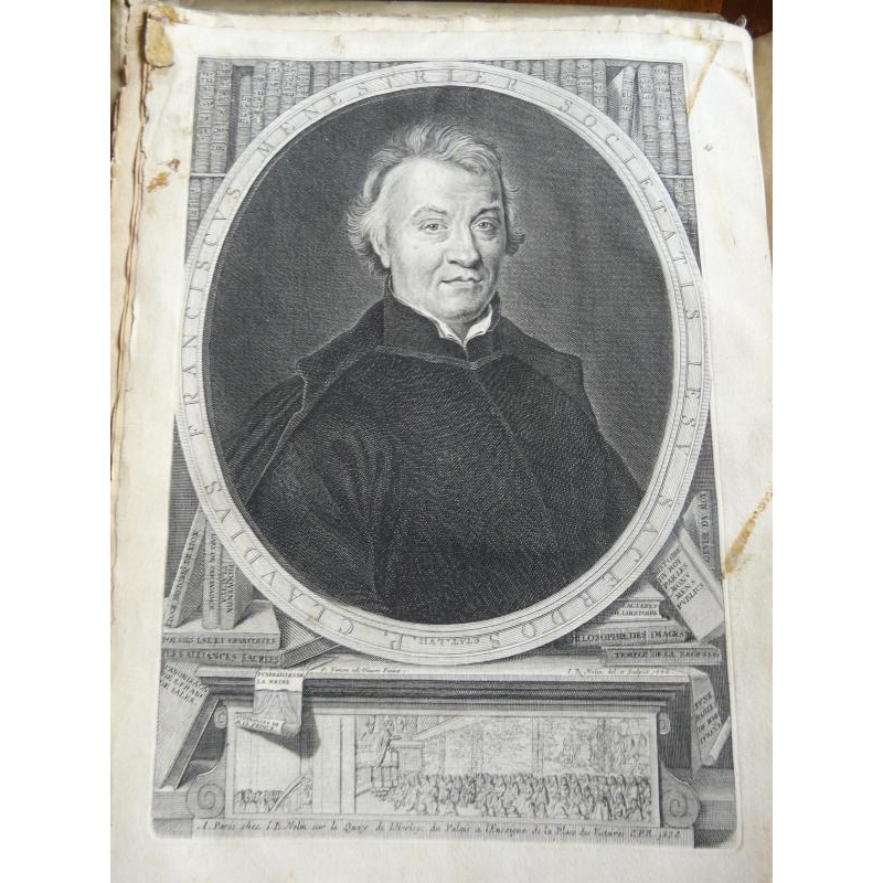 Provenance Charles Louis Von Bavière, avocat qui fut secrétaire de l'académie et de la société de droit de Bruxelles. Il enseigna l'histoire avec brio, et composa une importante bibliothèque fort bien choisie de plusieurs milliers d'ouvrages qui fut en partie dispersée en 1815. Cette provenance explique sans doute le type de reliure qui atteste un passage de l'ouvrage au nord de l'Europe, type de reliure fort rare et séduisante pour ce livre qui est plus fréquemment relié en basane ou en veau. Catalogue des oeuvres de Menestrier par Joseph Renard N°CXXVI pages 107,108,109.