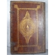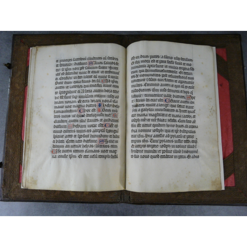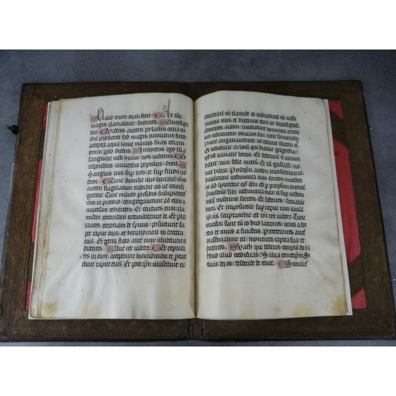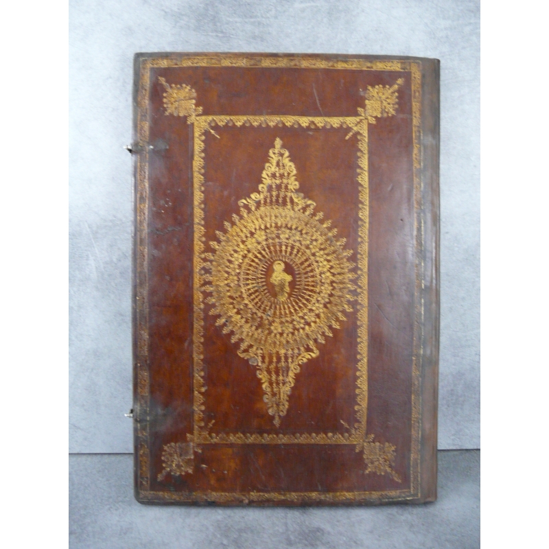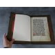 Un volume in folio dim vélin 33 x 22,5 cm, dim reliure 40,5 x 28 cm. 24 vélins, reliure plein maroquin vieux rouge sur ais de bois, fermoirs. décors iradian ou à l'éventail aux petits fers, dos refait, plats du XVIIe, remontage moderne bien réalisé de ces manuscrits emboités dans une ancienne reliure.