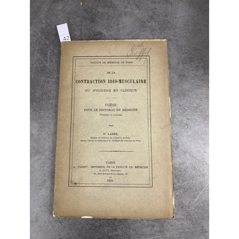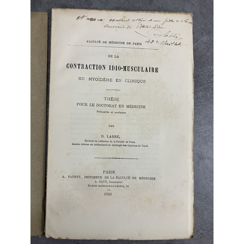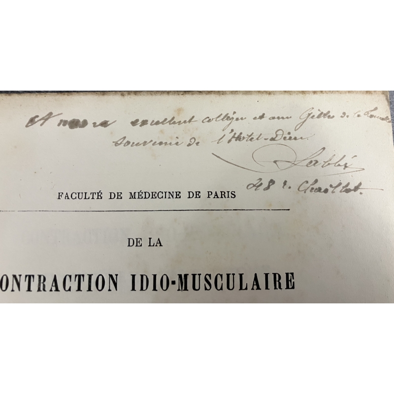Ex dono : "A mon excellent collègue et ami Gilles de la Tourette souvenir de l'hotel dieu " Labbé