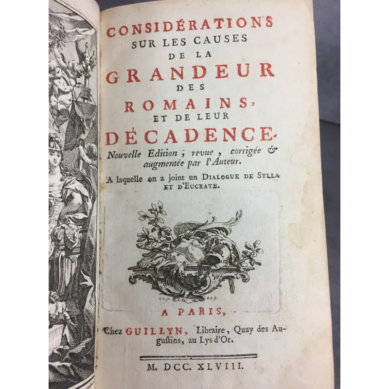 Montesquieu Charles-Louis de Secondat de , Considerations sur les causes de la grandeur des romains et de leur décadence, Nouvelle édition, revue, corrigée & augmentée par l'auteur. A laquelle on a joint un Dialogue de Sylla et d'Eucrate. Edition définitive et dernière originale paru du vivant de l'auteur