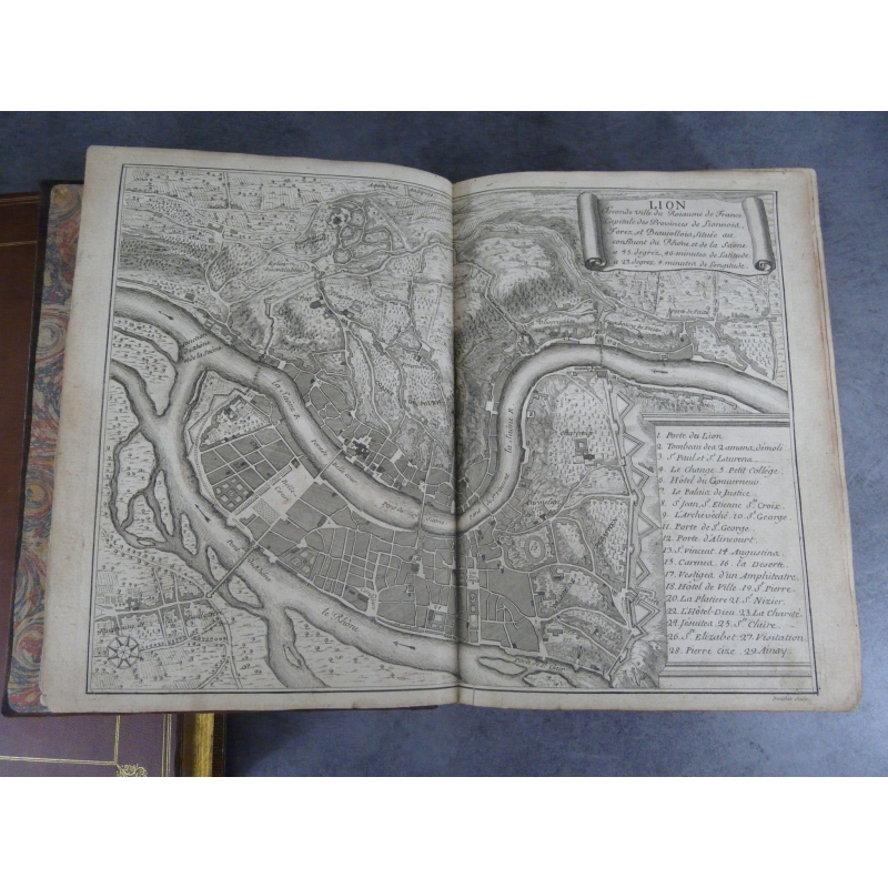 En outre il a été ajouté à l'époque à cet exemplaire les planches d'héraldique des prévosts couvrant la période suivante de 1712 a 1740 soit 26 planches et Les gravures double page XVIIe de vues de Lyon par Silvestre suivantes :Vue allegorique du Rhone et de la Saone