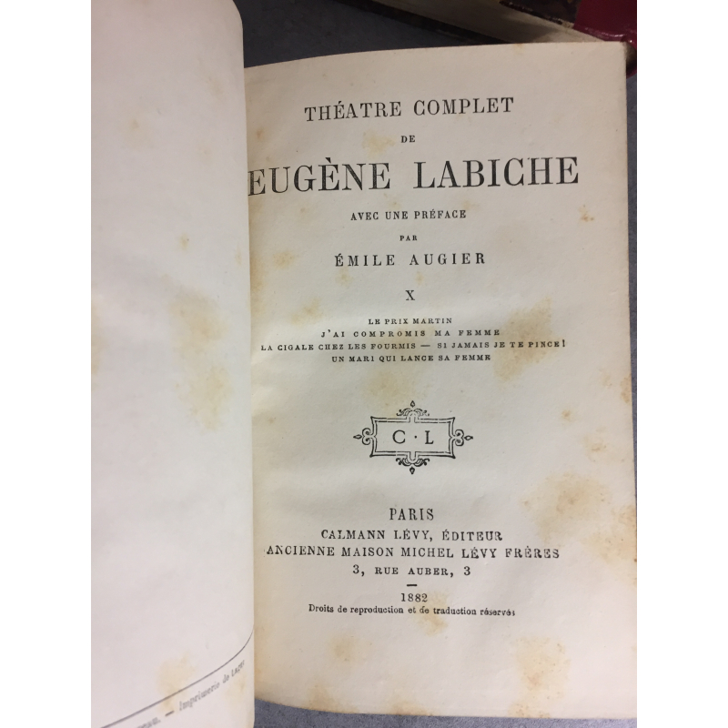 Paris Calmann Levy 1882 10 volumes 1_ x 12 cm de 500 pages environ chacun. Comprend une préface de Emile Augier et 57 pièces de théatre de Eugene Labiche (Voir photos de la table générale du Xe tome. ) Bon état général, des rousseurs, plus présentes dans les premières et dernières pages de chaque tome , Le 2eme plat du tome 9 a sans doute prix l'eau et la papier cuve cloque sur ce plat. Sinon RAS l'ensemble est homùagèene et en bon état hormis quelques rousseurs sans gêne à la lecture.
