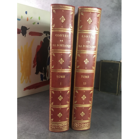 Deux volumes grand in quarto 33 x 27 cm de T1 LXIX pages. (Les sources et les illustrations des Contes, table par ordre alphabétique, notice sur La Fontaine, avertissement et préfaces de l'auteur), (1)feuillet et 288 pages, illustré de 53 planches hors-texte d'après Fragonard. T2 :418 pages,l'achevé d'imprimé est placé par erreur du relieur avant la page 414, illustré de 38 planches hors-texte d'après Fragonard. Chaque planche est protégée par une serpente portant la légende imprimée (Dessin de Fragonard gravé à l'eau forte par Martial ou gravure terminée édition de 1795). Achevé d'imprimé le 30 octobre 1882. Les exemplaires sont bien complets des portraits de La Fontaine et de Fragonard gravés par Martial, en frontispices.