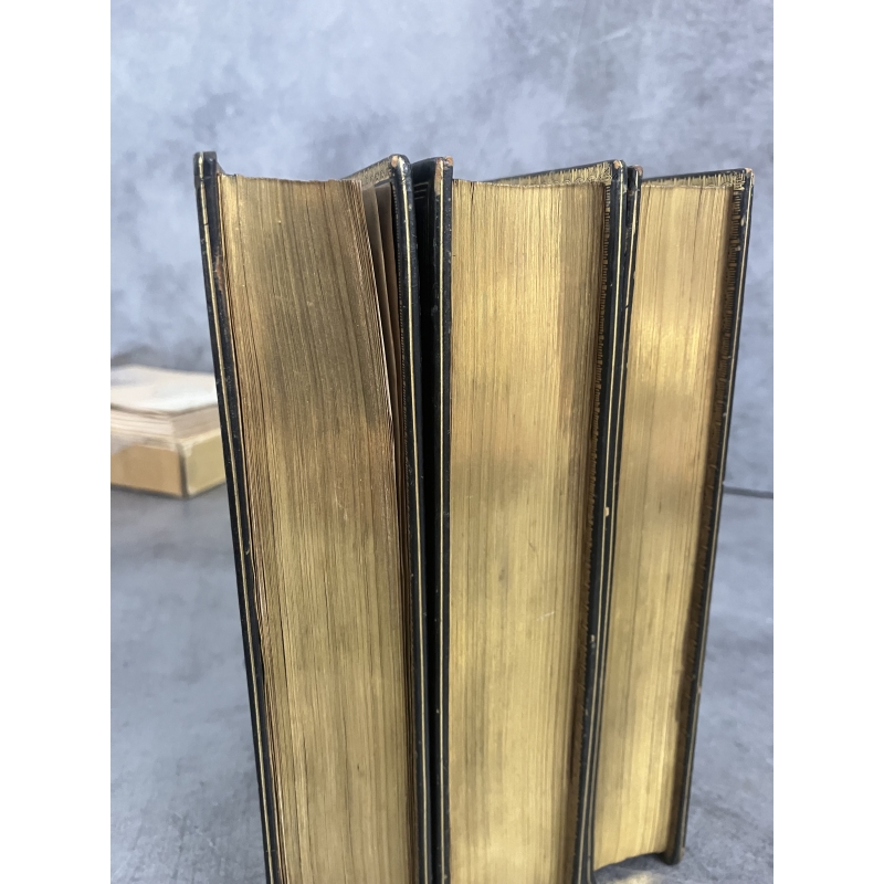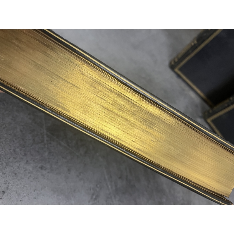 Reliure plein veau glacé marine nuit, dos richement orné, triple filets en encadrement des plats , filets sur les coupes, toutes tranches dorées lingot. Reliure signée Bibolet en pied du tome 1 . Infimes frottements, pas facile à photographier elles sont plus belles en main qu'en photo, ou des rayures peu visibles livres en main ressortent su les photos.