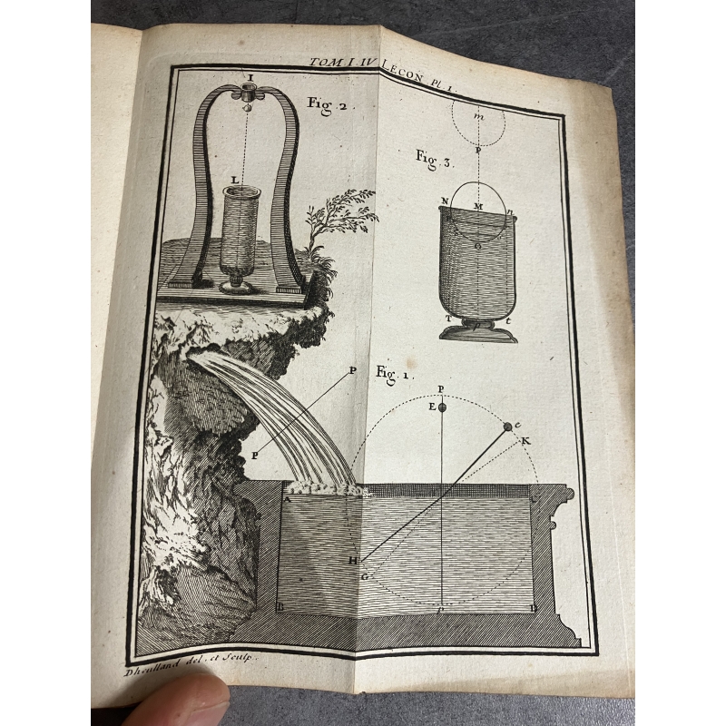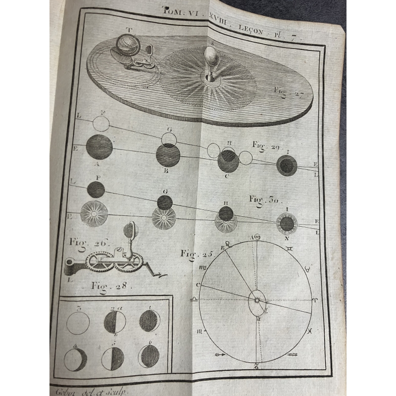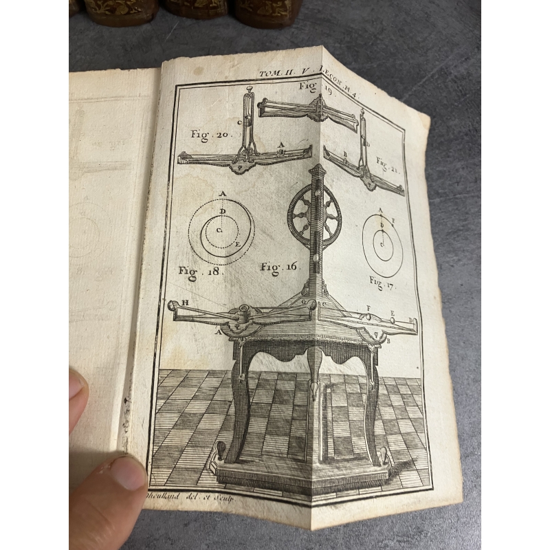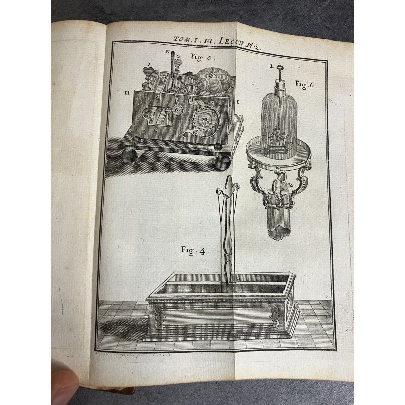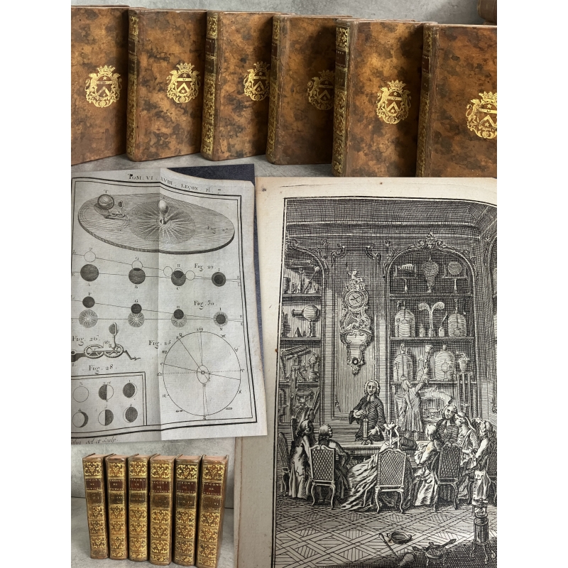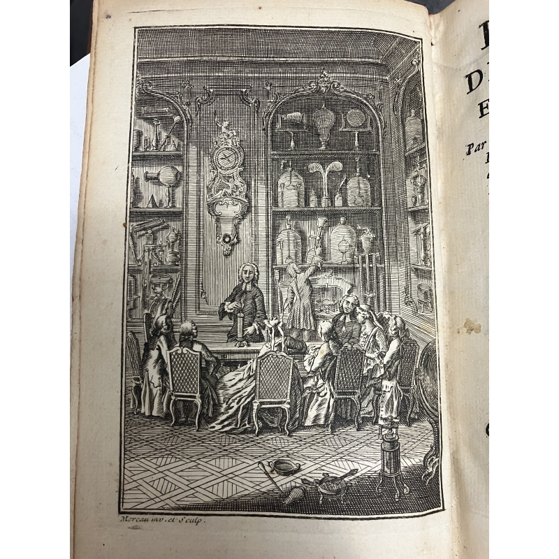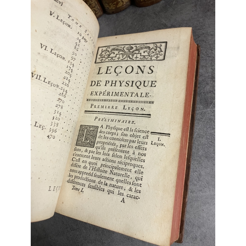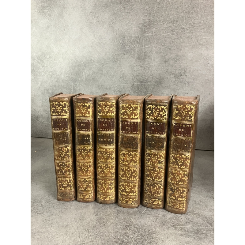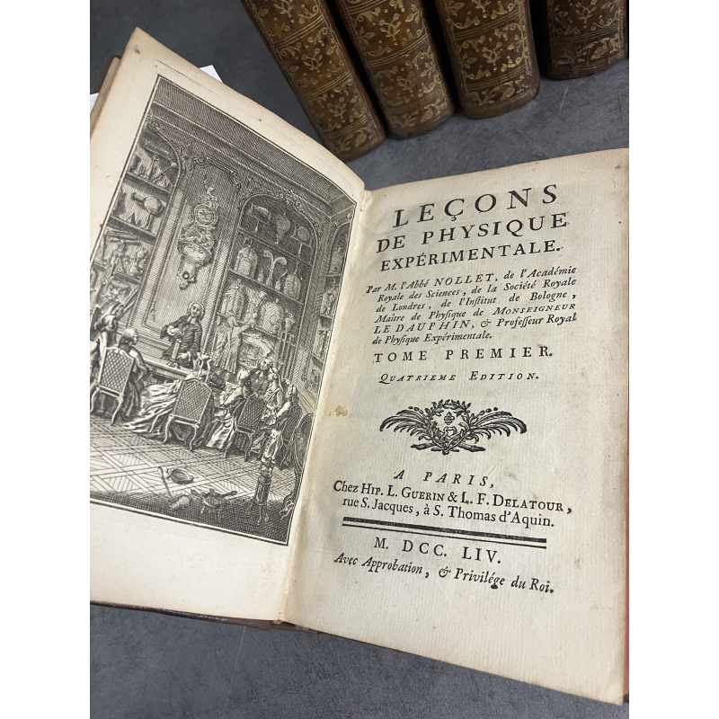 Paris Guerin et Delatour 1753-1765 6 volumes in12 de XCVI,379, 488 [3], IV 511, [2]535, VI, [2] 592, IV, 527 pages edition illustré d'un frontispice gravé à l'eau forte par Marceau et représentant une demonstration dans un cabinet de physique et 116 planches hors texte dépliantes , finement gravées sur cuivre par Dheulland, repréentant les instruments, appareils de physique et divers éléments illustrants les propos et démonstrations de Nollet.